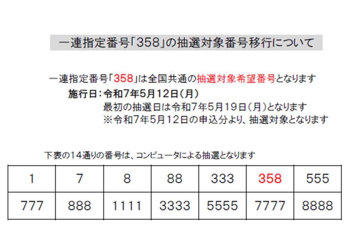 登録自動車及び軽自動車にて「358」は、払出数の増加により、全地域を対象に令和7年5月19日(月)の抽選から抽選対象希望番号となります。