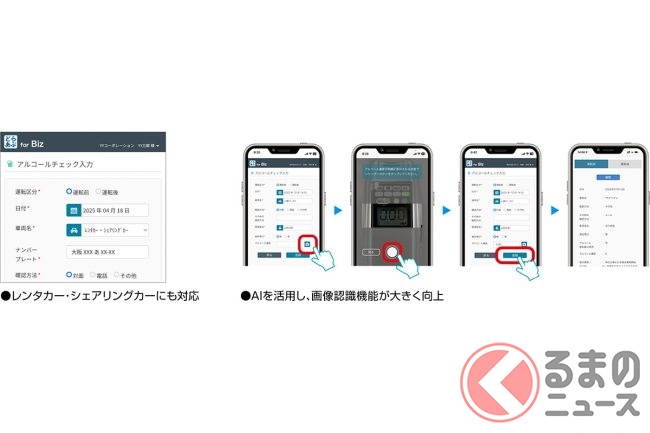 AIによる画像認識技術を取り入れ、アルコール検知器の数値をより正確に読み取ることが可能に。レンタカーやカーシェアといった社有車以外にも対応