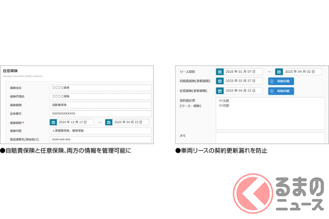 車両ごとのリース契約や保険情報をまとめて管理。契約更新のタイミングが近づくと自動で知らせる機能もあり、うっかりミスを防止