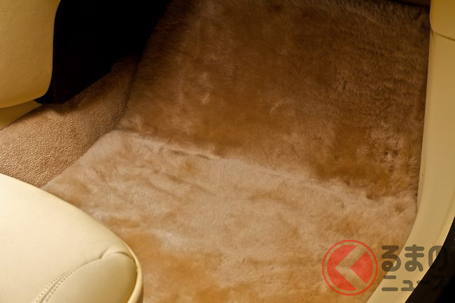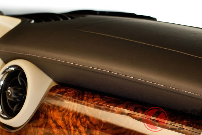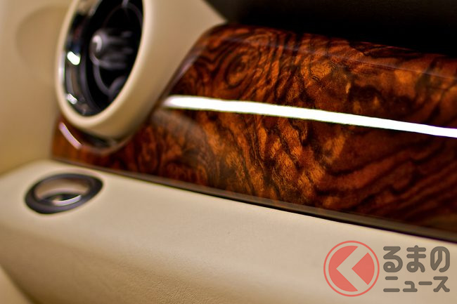 ウッドパネルには職人の手による「ウォールナット・バール」インレイが施され、さらに天井にはカシミア素材、フロアマットにはロールス・ロイス純正の毛足の長いラムウールが使われました。