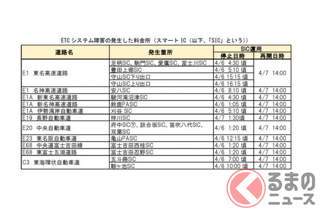 東名高速道路の17箇所、新東名高速道路の8箇所、中央自動車道の26箇所、東名阪自動車道の10箇所、伊勢湾岸自動車道の11箇所などで、ETCゲートのバーが開かなくなるというもので、料金所では混乱が発生。
