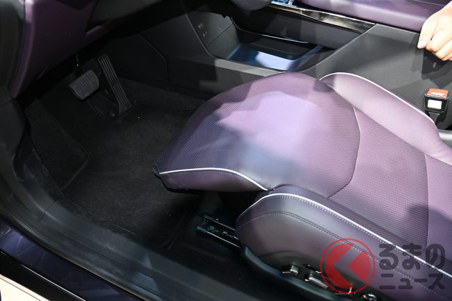 また、シートに座ってみると前席の足元が後席よりも深くなっています。床下にバッテリーを搭載しながら、普通のエンジン車と同様の着座姿勢を得ることができます。もちろんペダルはオルガン式。こういう部分は、日本開発のマツダ車と同じ走りへのこだわりを感じとることができました。