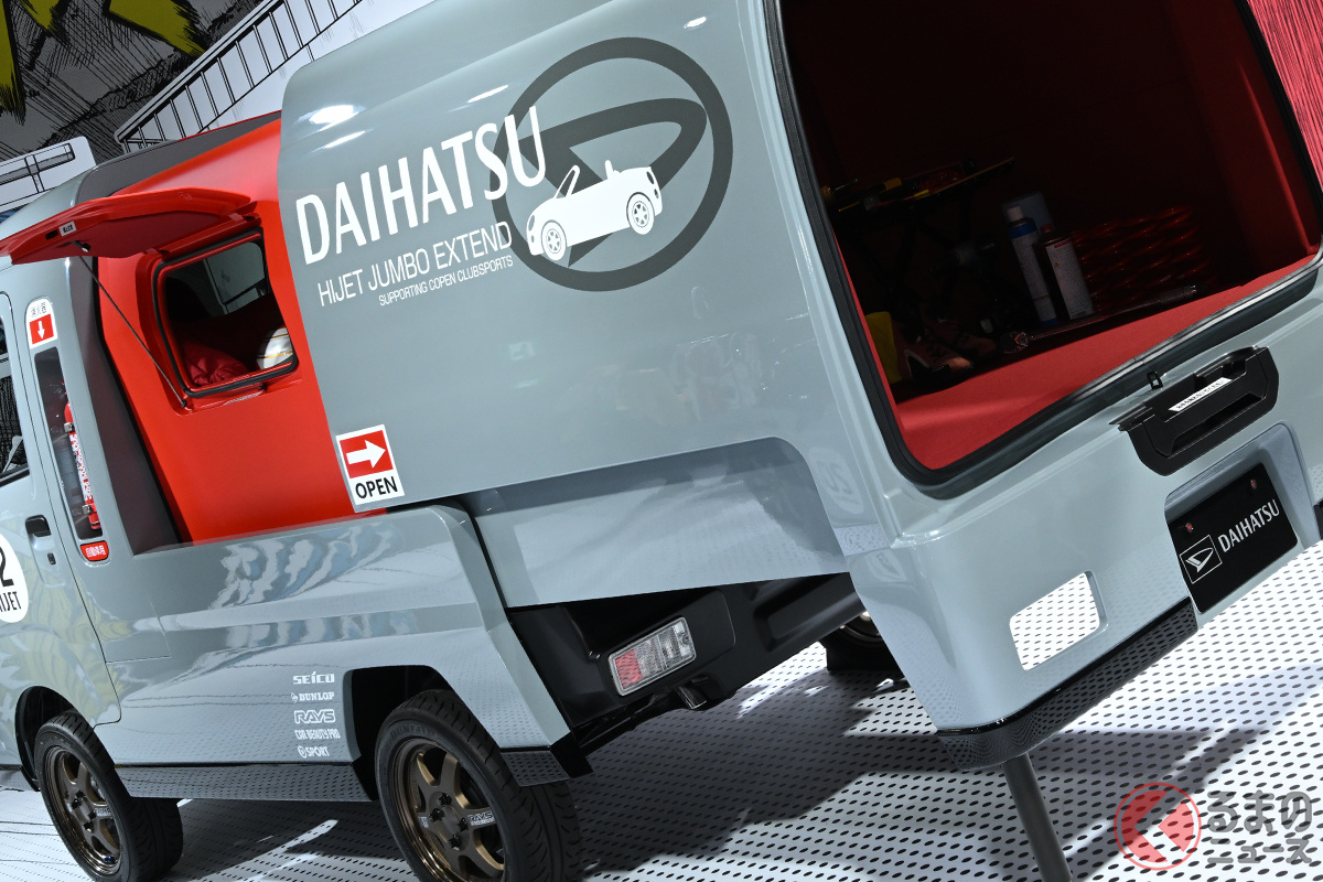 ダイハツ斬新「軽トラ」に大反響! 「“荷台が伸びる”なんて天才的」「多機能でオシャレ」「仕事も遊びも1台でイケそう」の声! “めちゃ広ッ空間”の「ハイゼット トラック ジャンボ エクステンド」に熱視線!