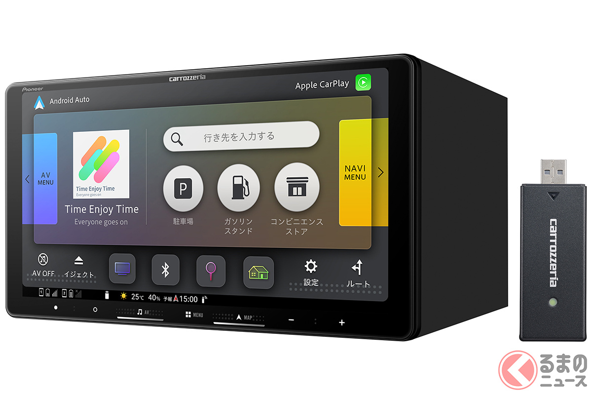 さらに、iPhoneやAndroidスマートフォンと接続して、対応アプリを本機のディスプレイで快適に操作できる「Apple CarPlay」(ワイヤレス接続)および「Android Auto」にも対応。対応アプリを本体ディスプレイに表示し、タッチパネル操作、またはSiri/Googleアシスタントによる音声操作で目的地の検索や音楽再生、ハンズフリー通話などが可能だと言います。