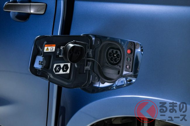外装ではリアの「EV」エンブレムや、フロントグリルに施されたブルーの差し色により、ディーゼル車との差別化を図っています。充電口は、ディーゼル車の給油口と同じところにあります。