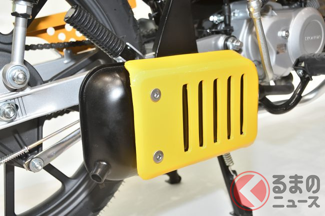特徴的なのは、サイドカバーやマフラーカバー、完成度の高い前後フェンダーなどのほか、フロントキャリアと車体の接合部に使われていたカバーパーツまで再現されている点です。一部のパーツは3Dプリンターによって製作され、細部までこだわりを見せています。