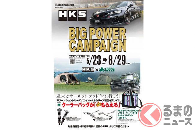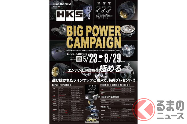 自動車用アフターパーツメーカーのHKS(エッチ・ケー・エス)は、2025年5月23日から8月29日まで、同社恒例の「ビッグパワーキャンペーン」を開催すると発表しました。
