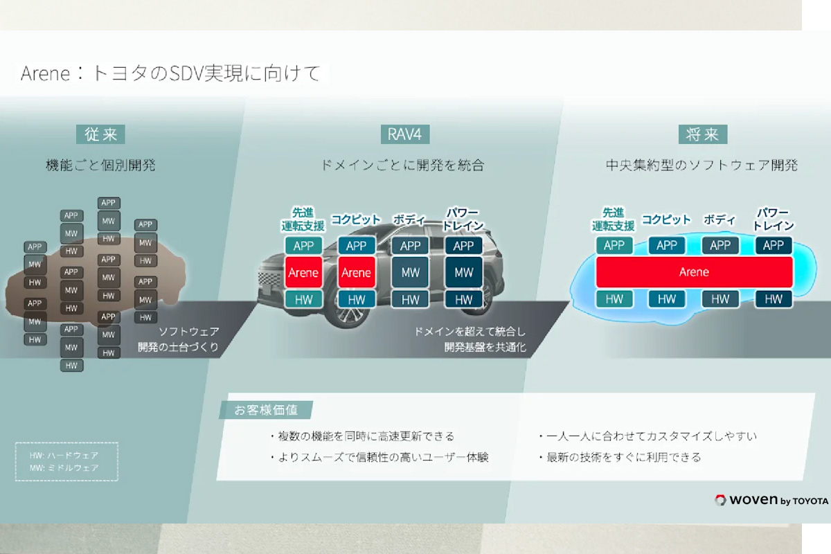 そのなかでAreneは、トヨタが長年培ってきたモノづくりの知見をソフトウェア開発に活かし、安全・安心で高品質なクルマを実現するためのプラットフォームです。