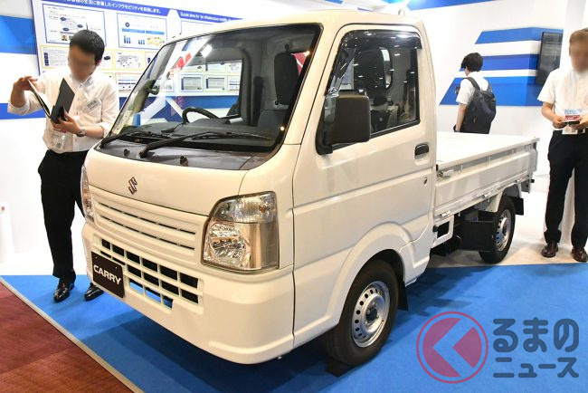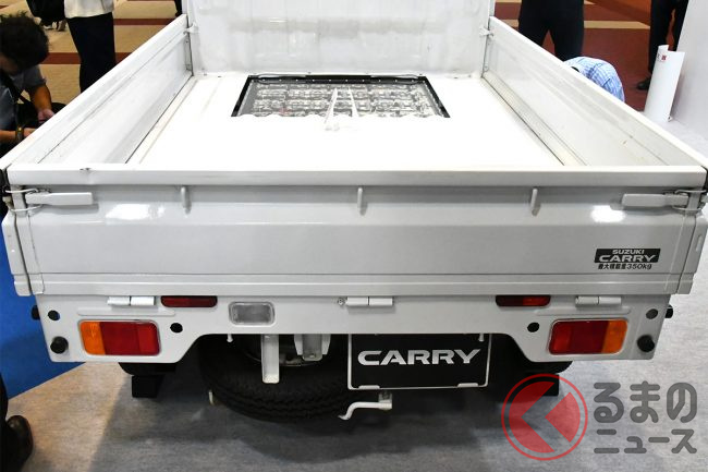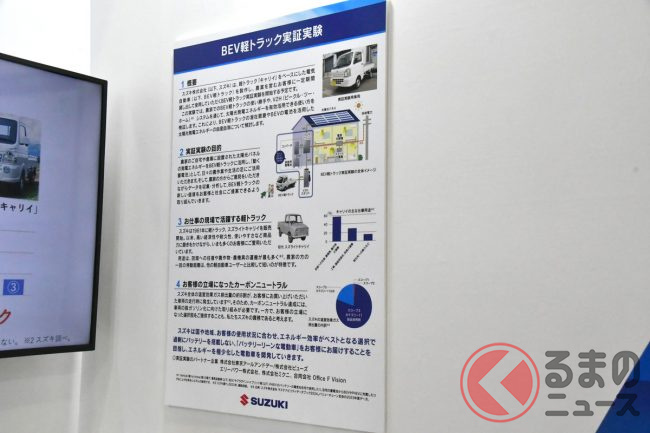 軽自動車やコンパクトカーなどを多く手掛けるスズキのブースでは、軽トラックの「キャリイ」をベースとしたBEV(電気自動車)が展示されています。