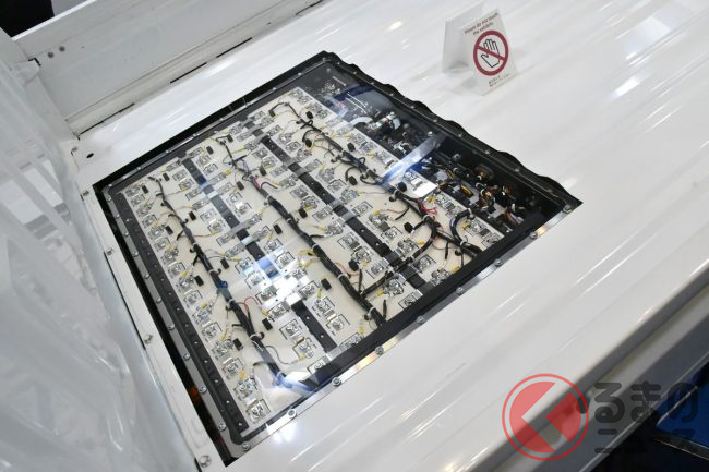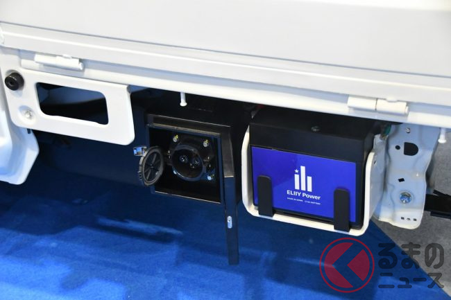 外観上の違いは、電気自動車の電力を家庭用の電源としても使用できるV2Hシステムを搭載するため、CHAdeMO規格のソケットが荷台左側下部に備わっている点です。とはいえBEVであるためマフラーがなく、軽トラックとしての積載性は全く犠牲になっていません。