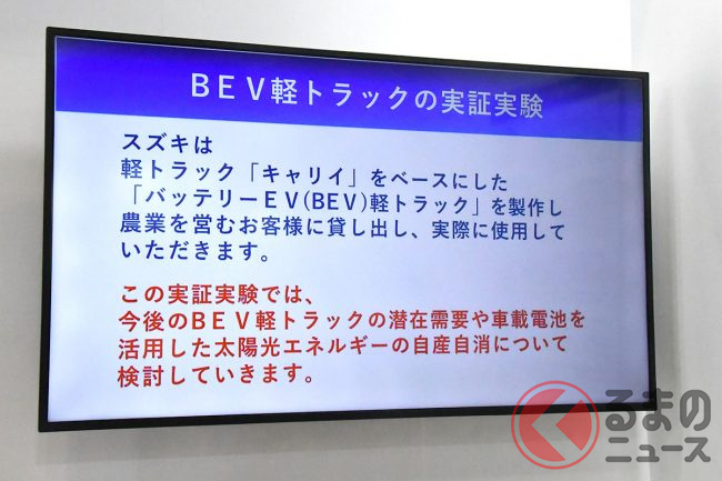 この車両は、「BEV軽トラック」の潜在需要や、BEVの電池を活用した太陽光発電エネルギーの「自産自消」に関する実証実験を行うために開発され、2025年4月に発表されたばかり。静岡県の浜松市と湖西市、愛知県豊川市、熊本県阿蘇郡の各地で、農業を営むユーザーに計6台の車両を貸し出し、その評価を得たいとしています。