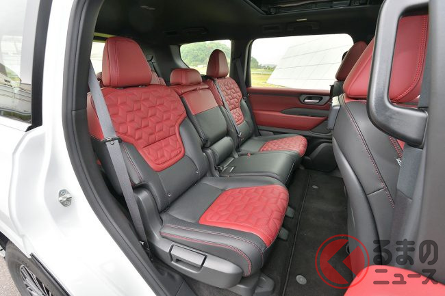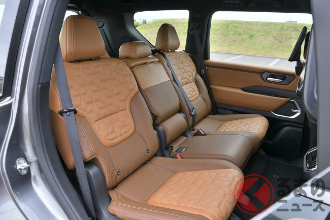 パトロールの車内は広々。2列目はもちろん、2列目を後方へスライドした状態での3列目にも足元には十分な余裕があって室内空間のゆとりを感じます。この広さは、ランクル300以上でしょう。