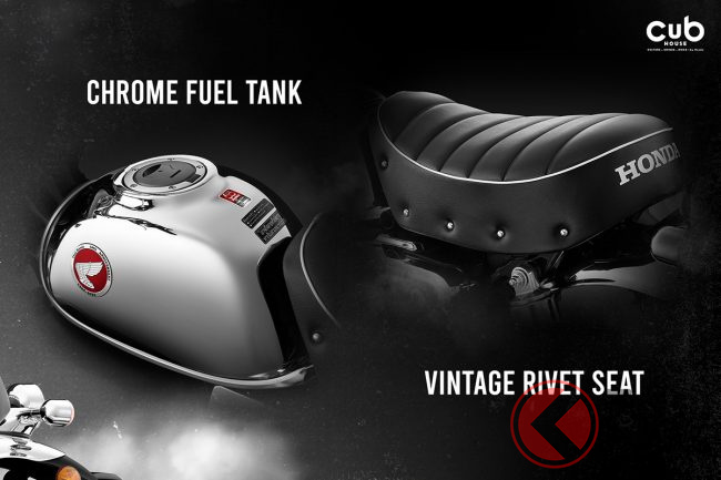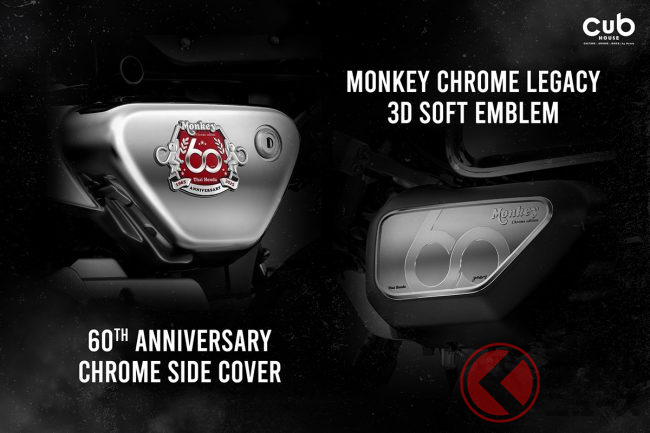 燃料タンクの両側にはヴィンテージ調のウィングロゴ、タンク上部にはシリアルナンバー入りステッカーが貼付。サイドカバーには「ツインモンキー」ロゴの記念エンブレム、エアクリーナーカバーにも特別なビトロエンブレムが装着されています。