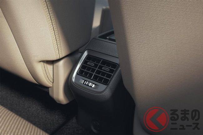 インパネ中央には9インチのインフォテインメントディスプレイを備え、スマートフォンとの連携機能やBluetooth接続、音声コマンドなどにも対応します。リアシートにもUSBポートとエアコンの吹き出し口が備えられており、後席の快適性にも配慮されています。