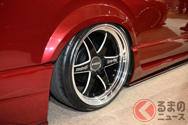 公道走行不可とのことですが、足回りには20インチホイールやワンオフのオーバーフェンダーによるドレスアップが施されていました。