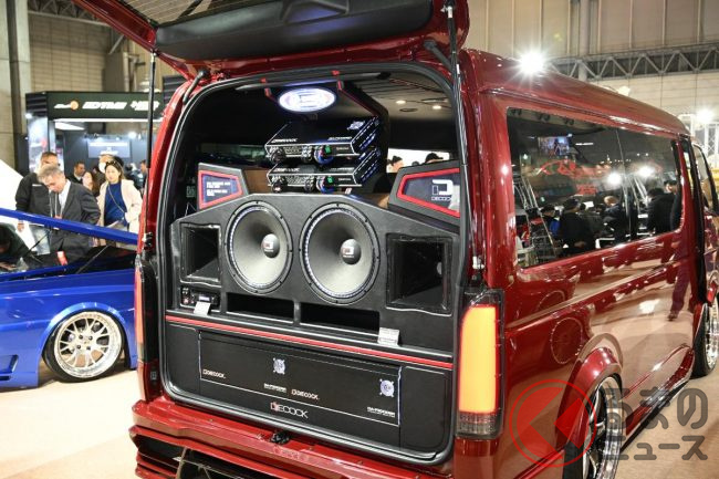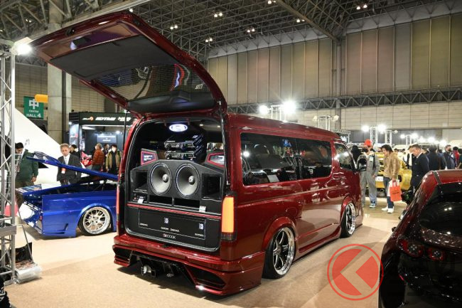また、リアには、DIECOOK製のアンプ&スピーカーを備え、迫力あるサウンドとインテリア性を両立させていました。B-DASHは、内外装のカスタムだけでなく、カスタムオーディオも得意とするショップで、その腕をしっかりと見せつけていました。