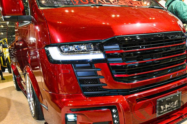 そんな2台がフュージョンしたゲツエースは、とってつけたような”顔面スワップ”でなく完璧な仕上がりを見せていました。B-DASHの担当者によると、「ハイエースの面影を消しトータル的にワンメイクカスタムする」をコンセプトに開発されたそうです。