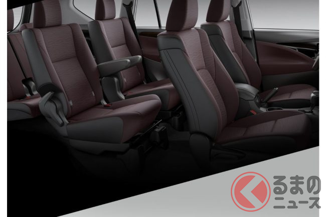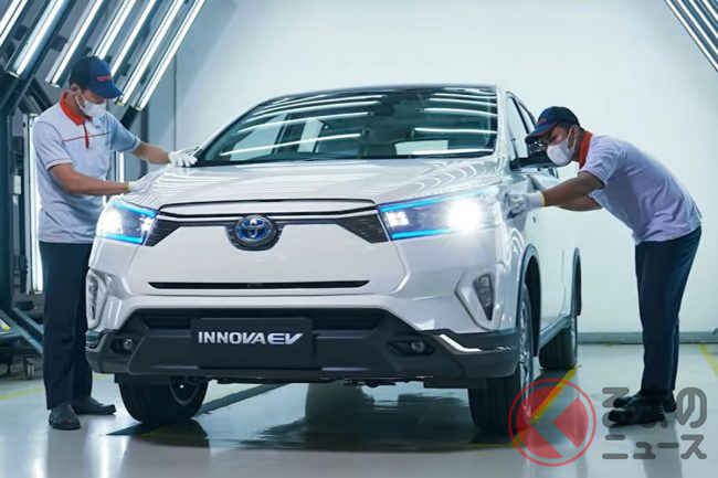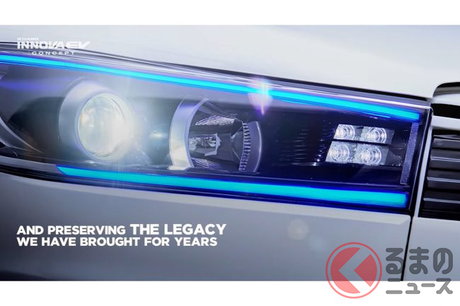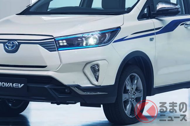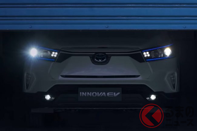 トヨタ“初”の「3列ミニバン」に注目! 「ハリアー」サイズのボディ&ツルツル顔採用! ブルーのアクセントや“専用デザイン”も魅力の「イノーバEV」インドネシア仕様とは?