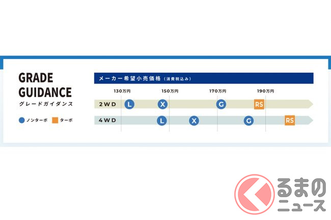 新型ムーヴの販売価格(消費税込み)は130万円台から190万円台で、グレードは「L」「X」「G」「RS」が用意されると紹介されています。