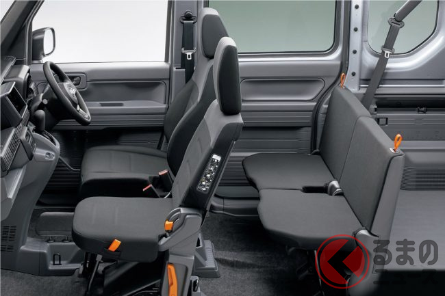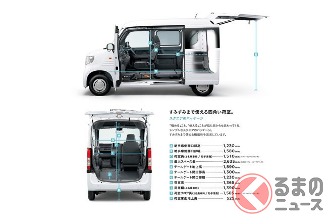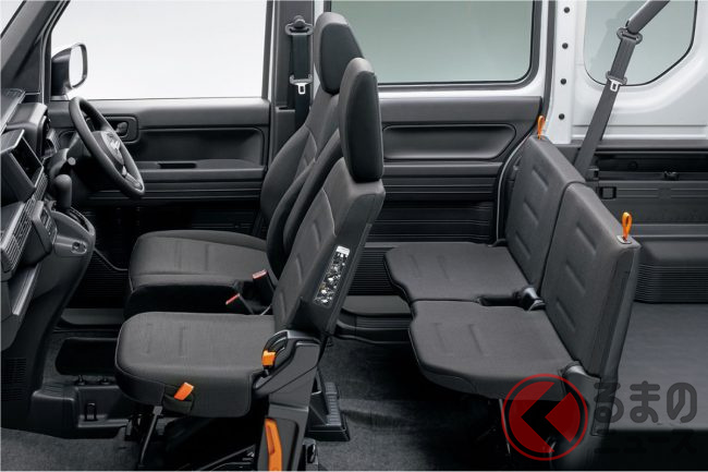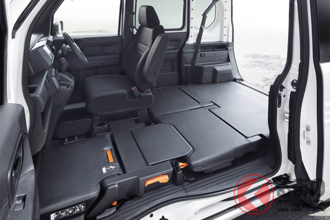 室内空間は荷室長1510mm(左部分・右部分は1330mm)×荷室幅1235mm×荷室高1370mmと広いサイズを確保しています。インテリアの装備は「いつでも気持ちよくはたらける空間」を目指し、使い勝手のいい収納や体をケアするシート、キズや汚れに強い内装仕上げなどを採用しました。