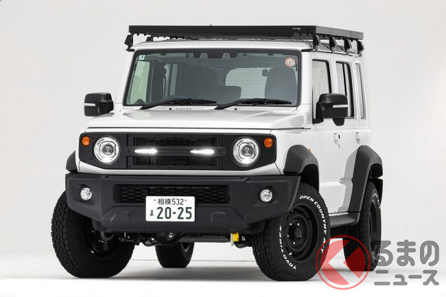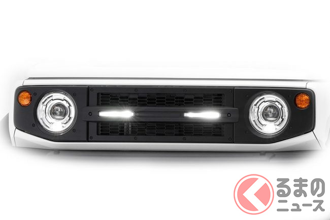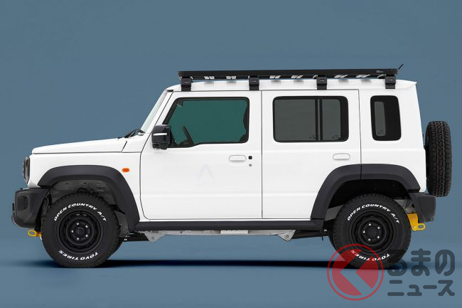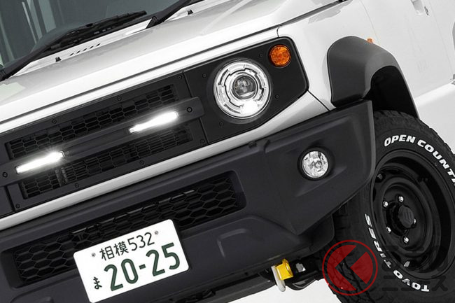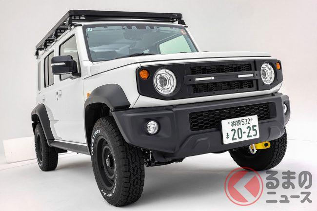 スズキ「ジムニー“5ドア”」ピカッと光る“斬新グリル”×ゴツいタイヤがカッコいい! 車高変えずにオフロード感マシマシ! 「ノマド」APIOカスタムパーツ登場!