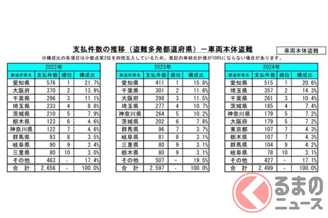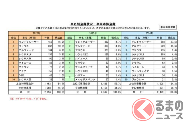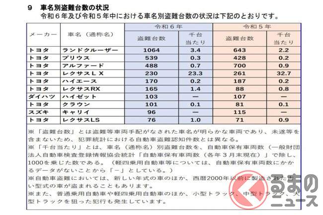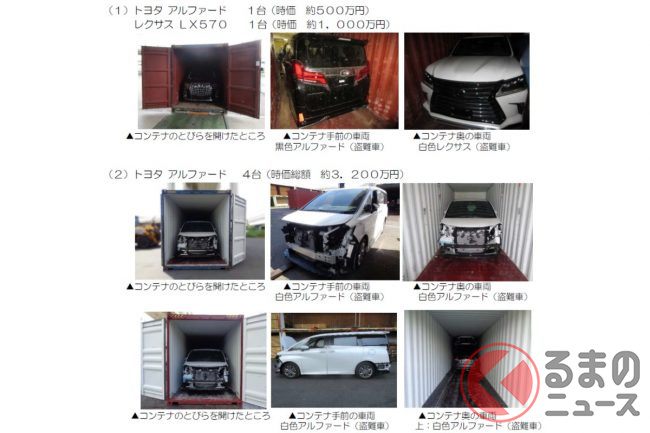 具体的な車種では、豪華なクルマが支持される中東地域での人気車であるトヨタ「ランドクルーザー」シリーズや「アルファード」、レクサス「LX」「RX」などは狙われるリスクが非常に高く、車名別の発生状況ではトップレベルです。