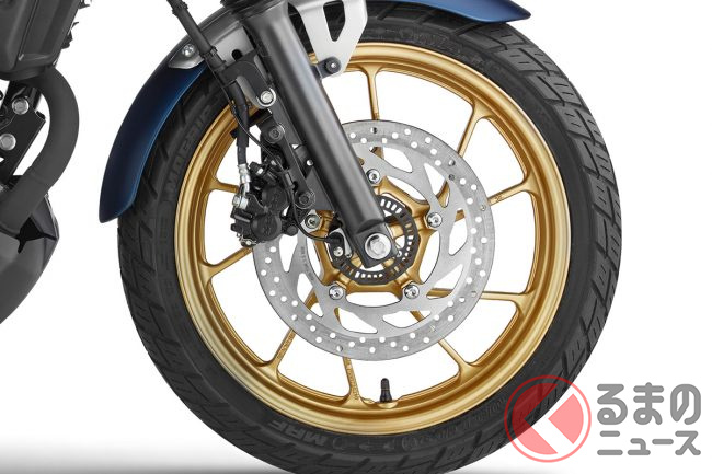 タイヤは前輪が100/80-17、後輪が140/60R17のサイズで、ブロックパターンのデザインがクロスオーバー的な雰囲気を演出。