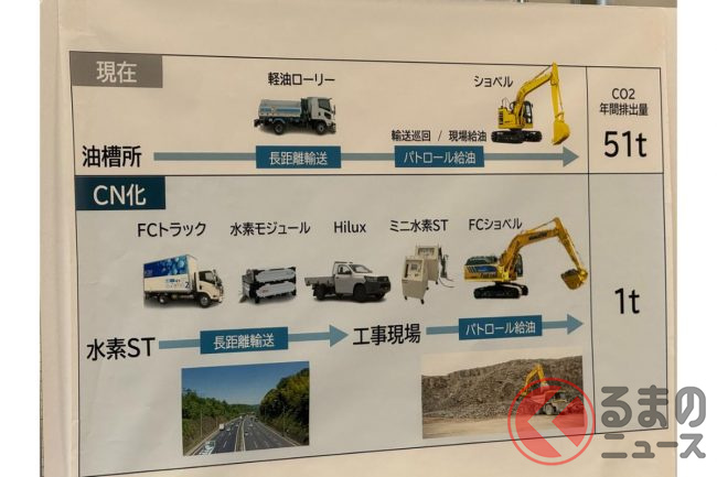 このようなソリューションがあれば、建設現場などで使われる建機にも水素を届けられるのではないか、という発想でトライアルを検討しました。