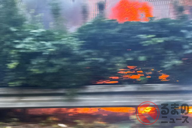 そして現場を通過する際、中央分離帯の木々で車両自体は見えなかったものの、ぼうぼうと燃える炎が確認でき、焦げ臭い匂いが周囲に充満していました。