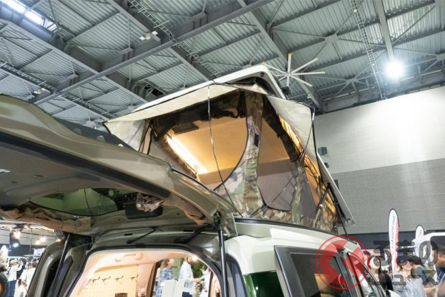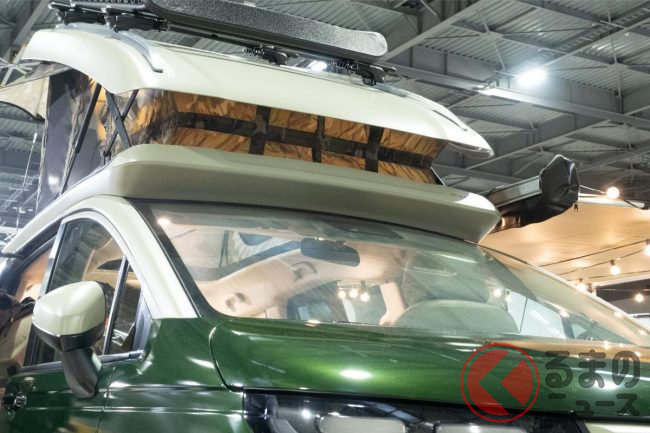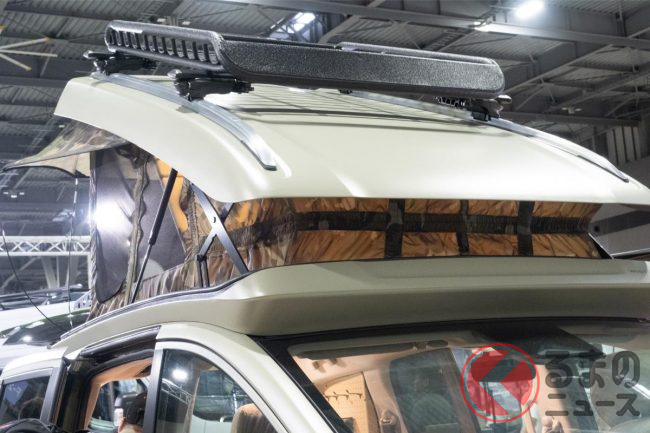 フロントにはバンパーガードを、側面にはサイドオーニングやオーバーフェンダーも配置しました。さらに、オリジナルだというポップアップルーフにはラックも取り付けており、アウトドア感を強めています。
