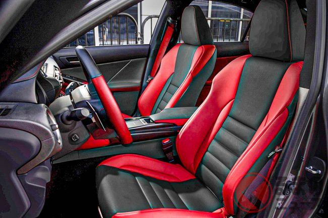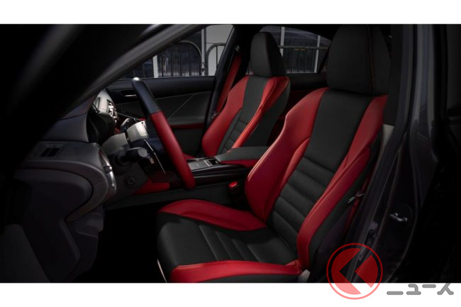 インテリアは、サーキットレッドとブラックの配色で統一され、シート表皮にはNuLuxe(ヌルクス=レクサスがよく用いる、革のような滑らかな肌触りと美しい色合いが特徴の人工皮革素材)とウルトラスエードのコンビネーション素材を使用。