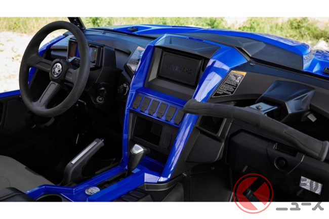 インテリアは円形ステアリングに加え、ダッシュボードにはマットアルミの加飾パネル、ヤマハブルーのイルミネーションを備えるなどし、ヤマハブルーのカットアンドソーシートと合わせ、乗用車風の豪華で上質な空間にまとめています。