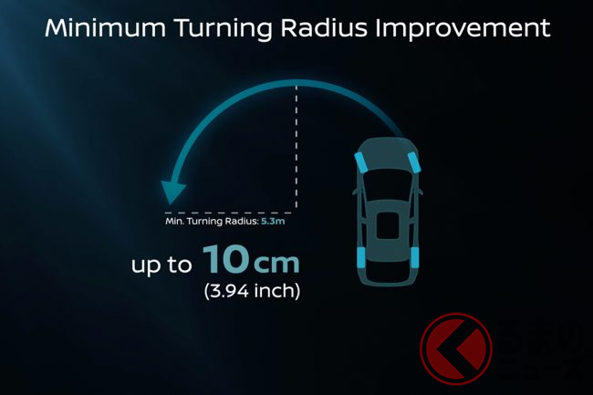 また新型リーフでは大径19インチホイールを採用しますが、ラックアシストタイプの電動パワーステアリングシステムの改良により、最小回転半径を0.1メートル改善し、5.3mをマークします。