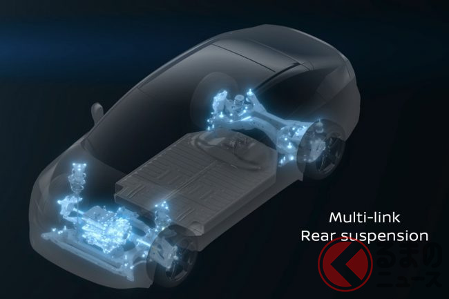 リアサスペンションは従来のトーションビーム式に代わり、マルチリンクサスペンションを採用して車体の横剛性を66%向上させ、CMF-EVプラットフォームや高剛性ボディ構造とともに、俊敏性と乗り心地も大幅に改善されました。