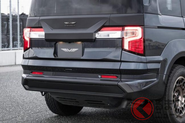 ボディサイドは直線を強調したタフなデザインのフェンダーや各ドアに取り付けるトリム、リアクォーターのデコレーションパネルなどで、装甲車のようなゴツゴツとしたデザインを強調。なおこれらのパーツにより、片側30mmのワイドボディ化が図られています。