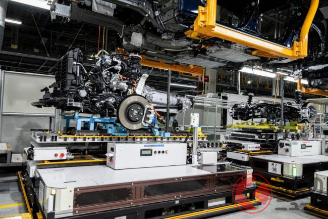 次に無人搬送車(AGV)を用いた生産工程として、吊られているボディにAGVに載せたバッテリーを搭載する様子、2台のAGVを使って1度にエンジン+トランスミッション、リア足回りを載せる様子を見学。