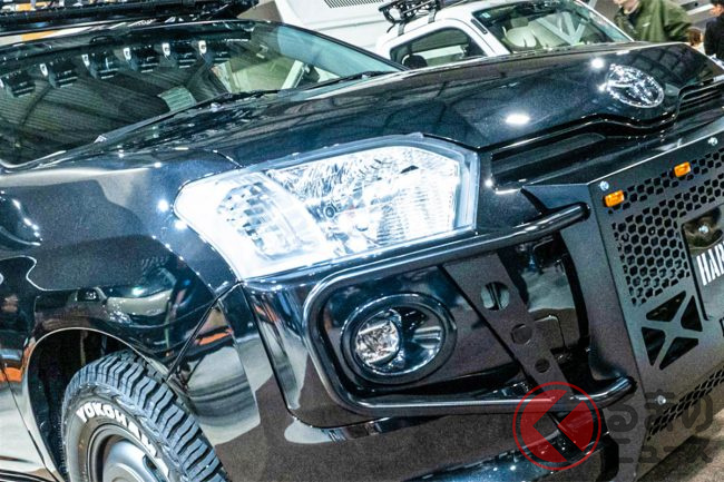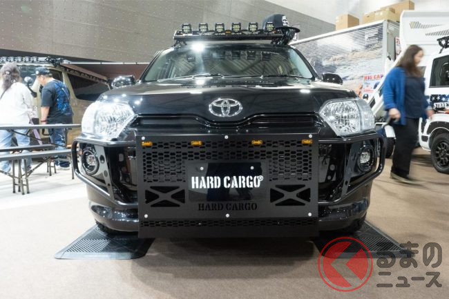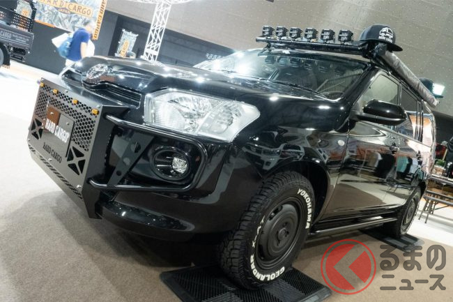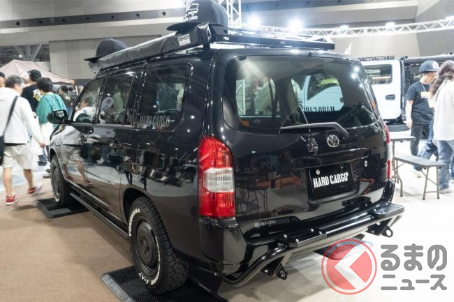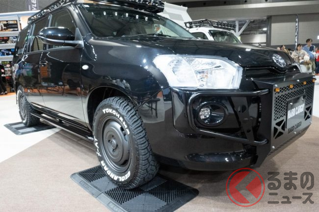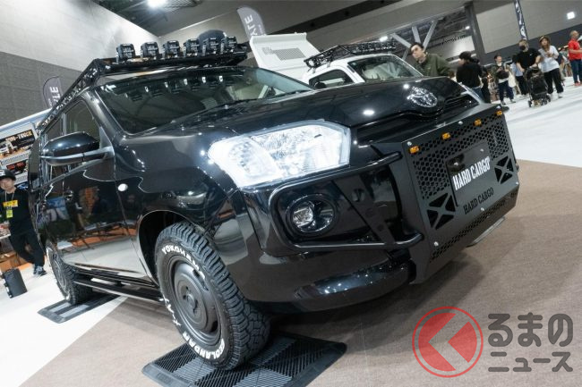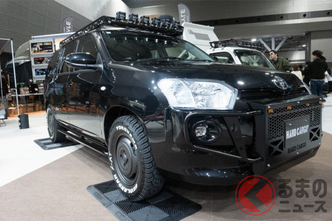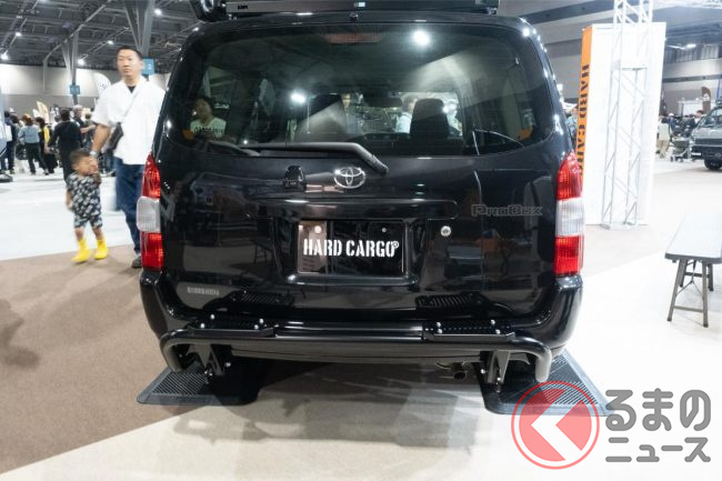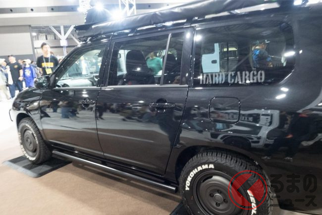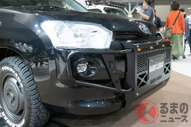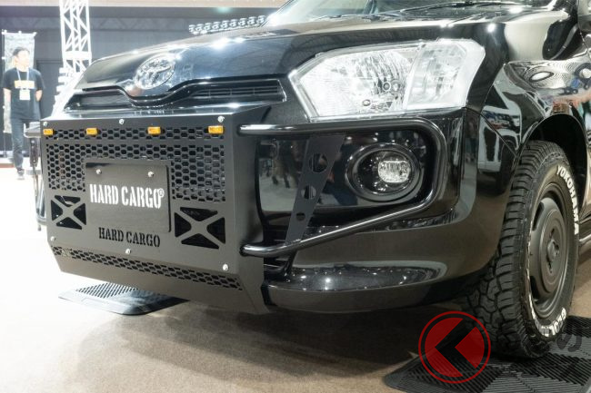 タフ顔の「プロボックス“SUV”」公開! 全長4.2m級のトヨタ「商用車」にコ゚ツい「バンパーガード」装備! 漆黒ボディがイイ「ハードカーゴ仕様」登場