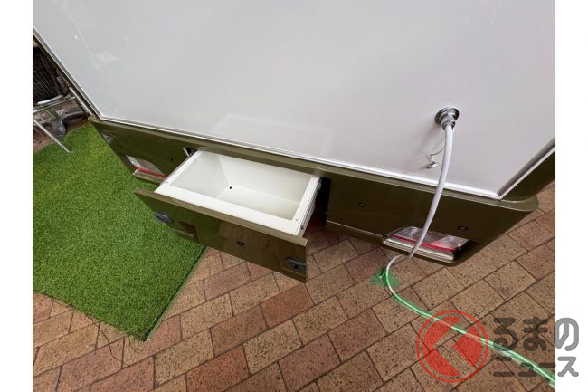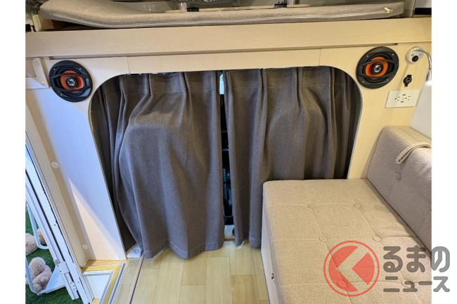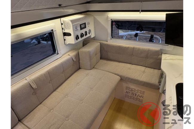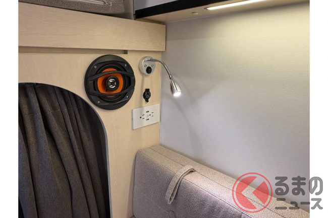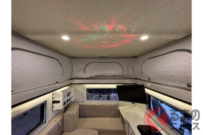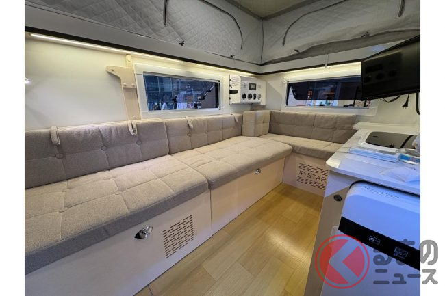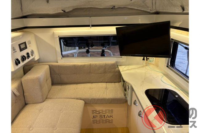 ほかにも電動格納式オーニング(日除け)や外部シャワー、150Wソーラーパネルが付いており、オプションを追加すれば、冷蔵庫やTVモニターも取り付けることができるなど、本格キャンピングカーに匹敵する装備の充実度です。