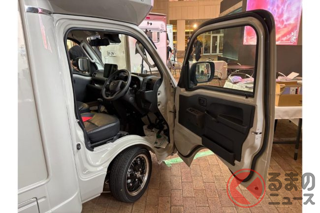 なかでも展示車の1台であるHappy1+ city TYOは、ダイハツの軽トラックである「ハイゼット トラック」をベースとしたキャンピングカーで、今回限定カラーモデルが登場しました。車両について、担当者は以下のように説明します。