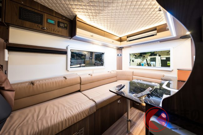 後部は従来モデルと共通しており、プッシュ式の電子キーや、電動のサイドオーニング、ビルドインクーラー、冷蔵庫、収納を兼ねた展開式のフラットベッド、バンクベッドなど快適に過ごせる装備が充実しています。