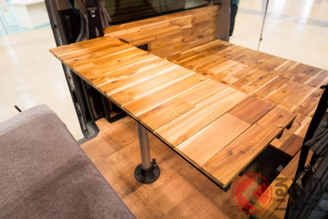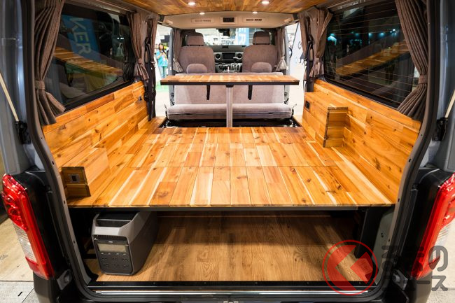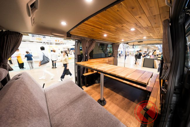 一見しただけではベース車がわからない、特徴的な丸目4灯のフロントフェイスや、オリジナルのサイドガーニッシュによってスタイリッシュに生まれ変わったサイドビューが目に入るGMLVAN V-02ですが、“バンライフカー”ということで、インテリアがしっかり作り込まれている点も見逃せません。