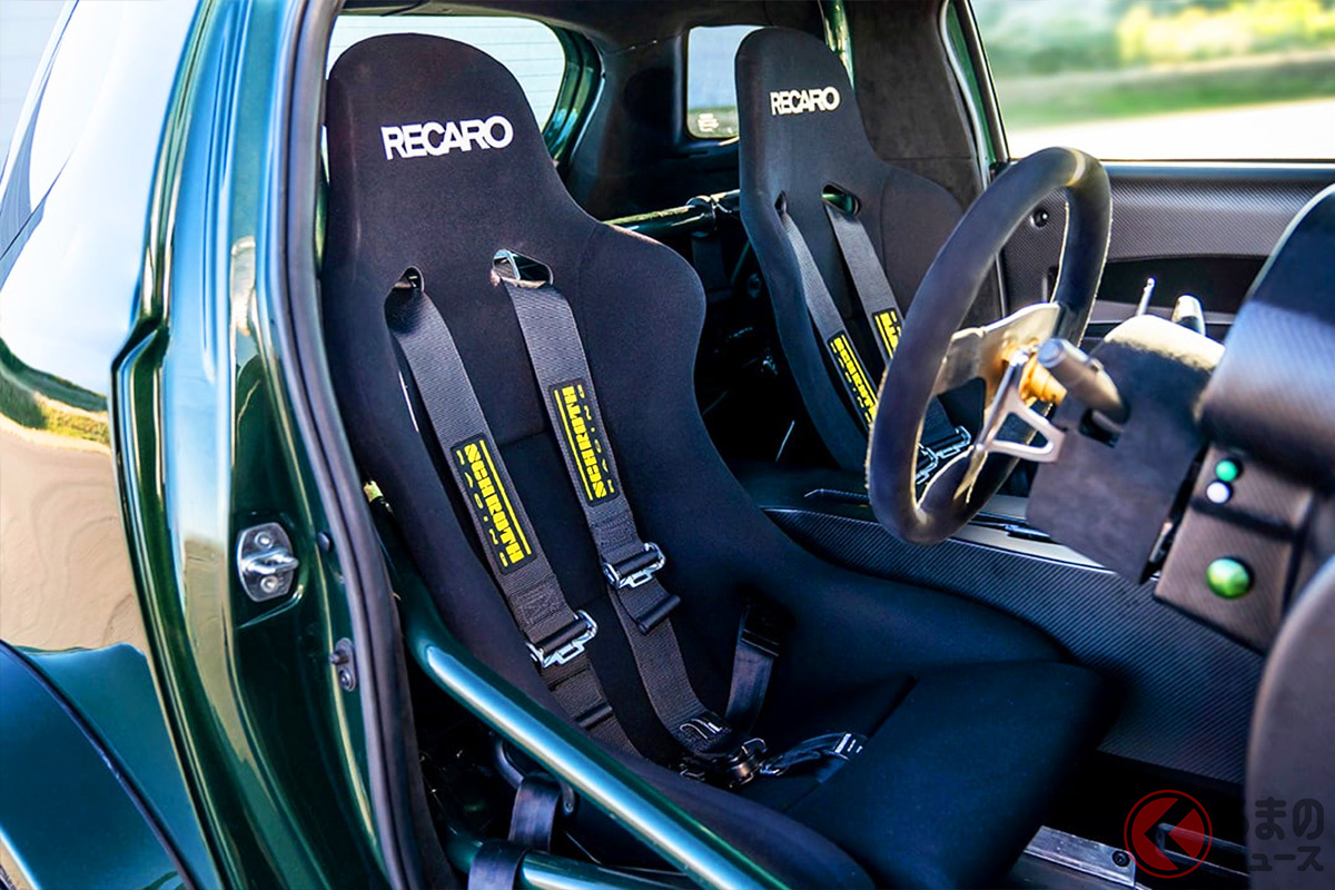 室内はレースカーを彷彿とさせる仕様で、2シーターのレカロ製シートには4点式ハーネスが装備され、ロールケージや取り外し可能なアルカンターラ製ステアリングホイールが備わっています。
