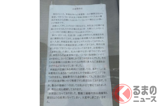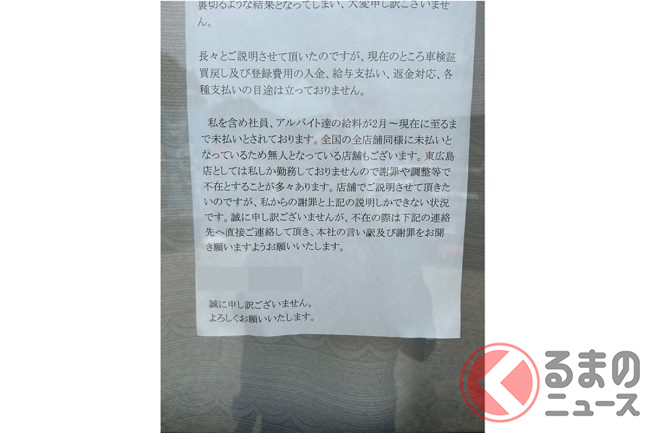 中には納車できるクルマに関しては納車だけでもしてあげようと無償で数か月働いてきた従業員もいたようです。