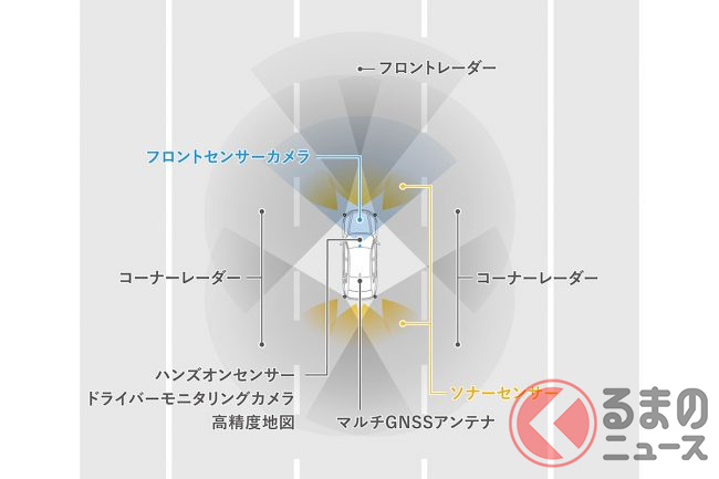 高速道路でGPSと高精度地図情報を活用し、アクセル、ブレーキ、ステアリング操作を支援してハンドルから手を離したまま速度と車線中央を維持します。