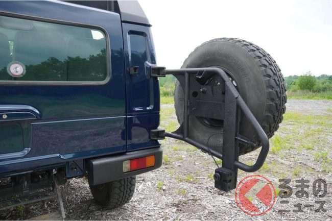 さらに、後部にはスイングアウェイ式のスペアタイヤキャリアや、ピントルヒッチが装備され、アウトドアや過酷な環境での使用を意識した作りになっています。