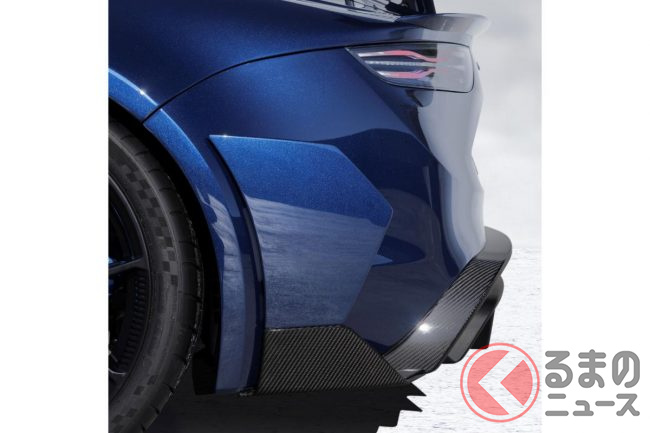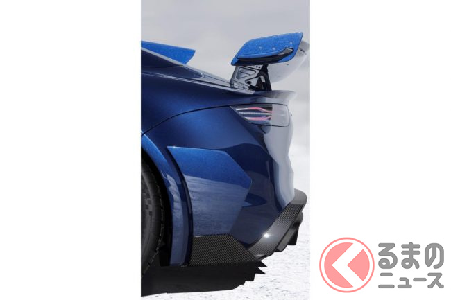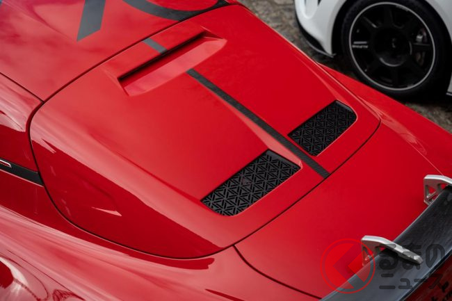装着されているカーボンパーツのうちボンネット、 ルーフ、リアフードがボディ同色にペイントされ、ルーフには70周年ロゴがデザインされています。
