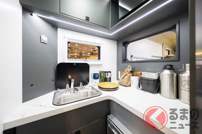 ボディサイズは全長4955mm×全幅1800mm×全高3000mmで、一般的なキャブコンタイプのキャピングカーよりもひと回り小さく、最小回転半径も4.4mと、軽自動車並みに小回りが利くのがスゴイところ。