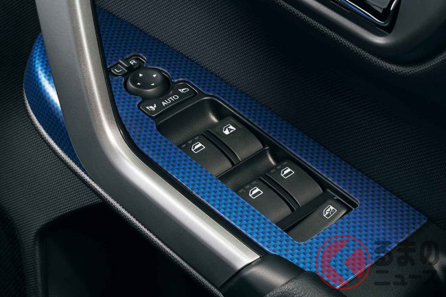 「ブルーカーボン調パック」はハイブリッドモデル専用として設定されており、スマートな印象を与えるブルー加飾が特徴。インナードアハンドルベゼルパネル、シフトベゼル&センターコンソールパネル、パワーウィンドウスイッチパネルの3点をブルーカーボンでまとめています。