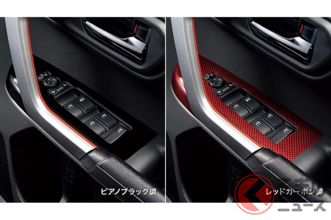 「レッドカーボン調パック」は、よりスポーティな雰囲気を求める人に最適で、インテリアの随所に赤のアクセントが効いており、ブラック基調の車内に鮮やかなコントラストを生み出します。