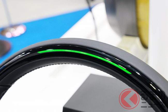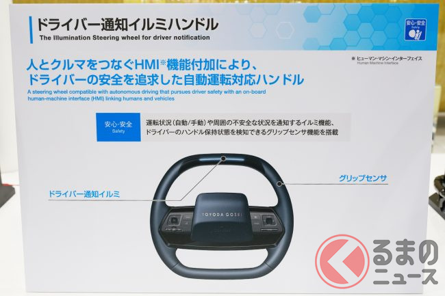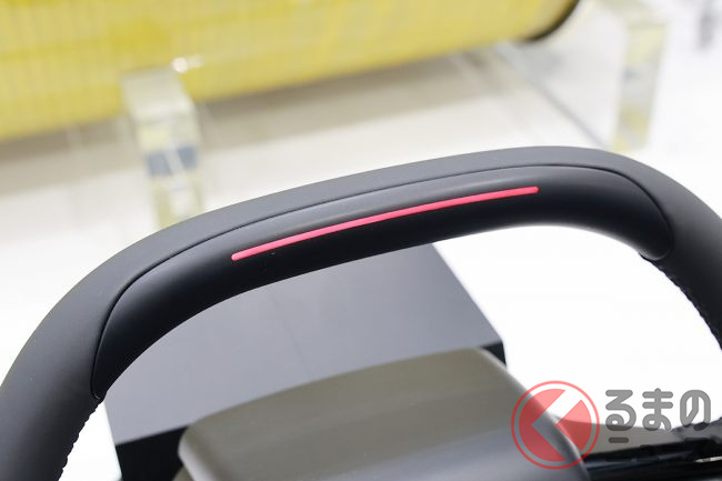 同じくステアリングホイールの出展アイテムとして「ドライバー通知イルミハンドル」も展示されていました。こちらには通知用のイルミネーション機能が搭載されており、運転状況(自動/手動運転時)の状態を直感的に伝える工夫が施されています。